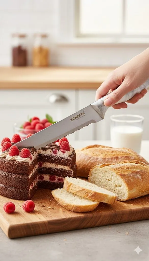 شفرة مسننة عالية الدقة: الشفرة الطويلة والمسننة مصممة خصيصاً لتقطيع الخبز الطري (مثل العيش الفينو أو الفرنسي) والكعك والتورتة متعددة الطبقات بسهولة ونظافة دون سحقها.