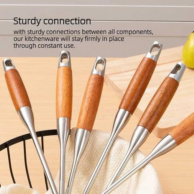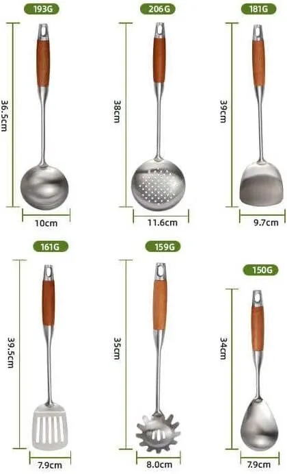 تصميم مريح: تتميز كل أداة بهيكل متوازن مع أقسام مقبض خشبية للتعامل المريح والآمن أثناء الطهي