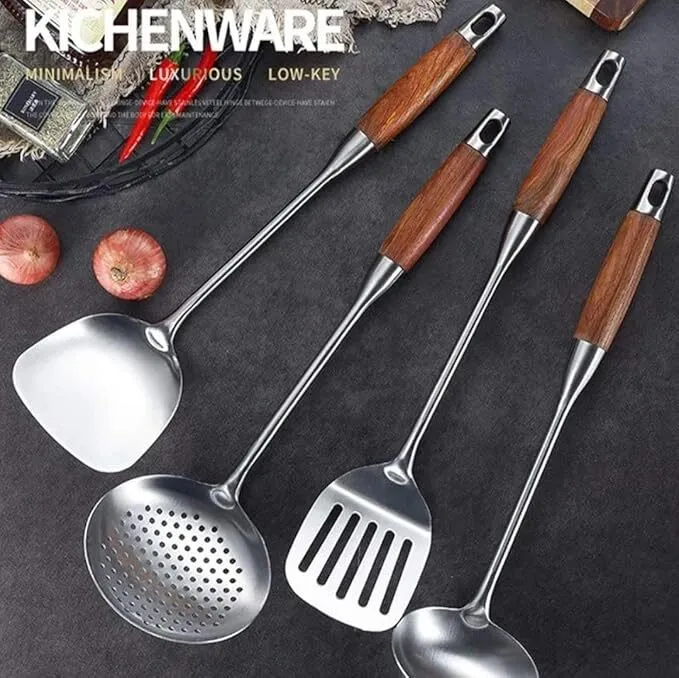 مواد فاخرة: مصنوعة من الستانلس ستيل 304 عالي الجودة مع مقابض خشبية أنيقة من أجل المتانة وقبضة مريحة
