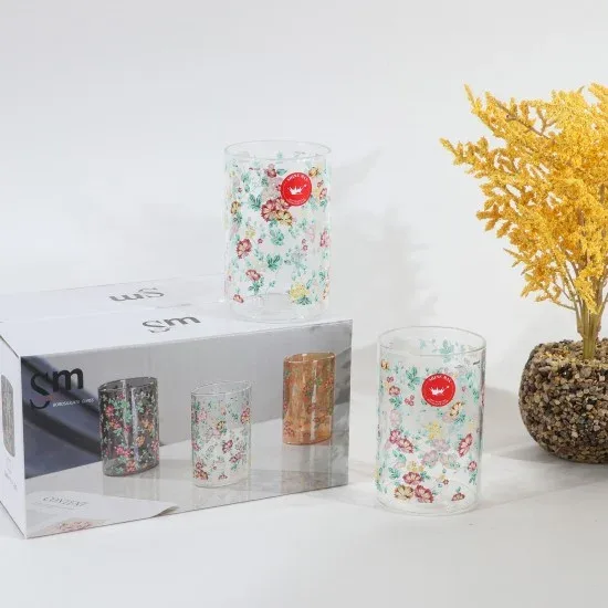 أضف لمسة جمالية إلى مشروباتك مع هذا الكوب الزجاجي الشفاف المزين بزخارف زهور بألوان حيوية من الأحمر والأصفر والأخضر. مثالي لتقديم الماء، العصائر، أو المشروبات الباردة بأسلوب أنيق وملفت.