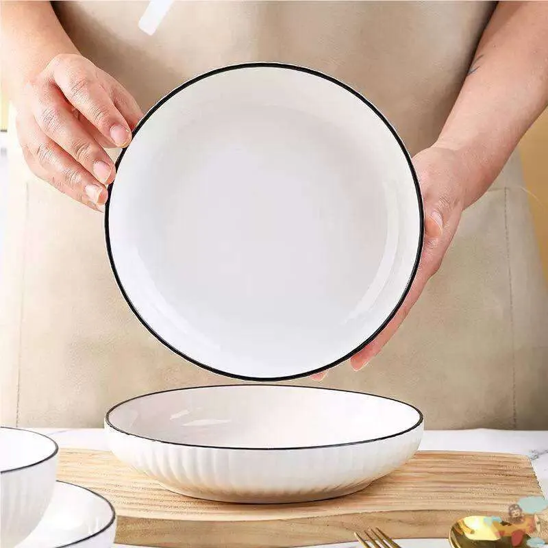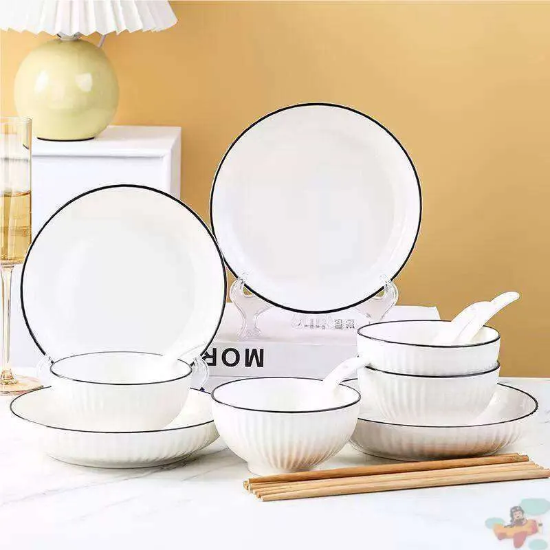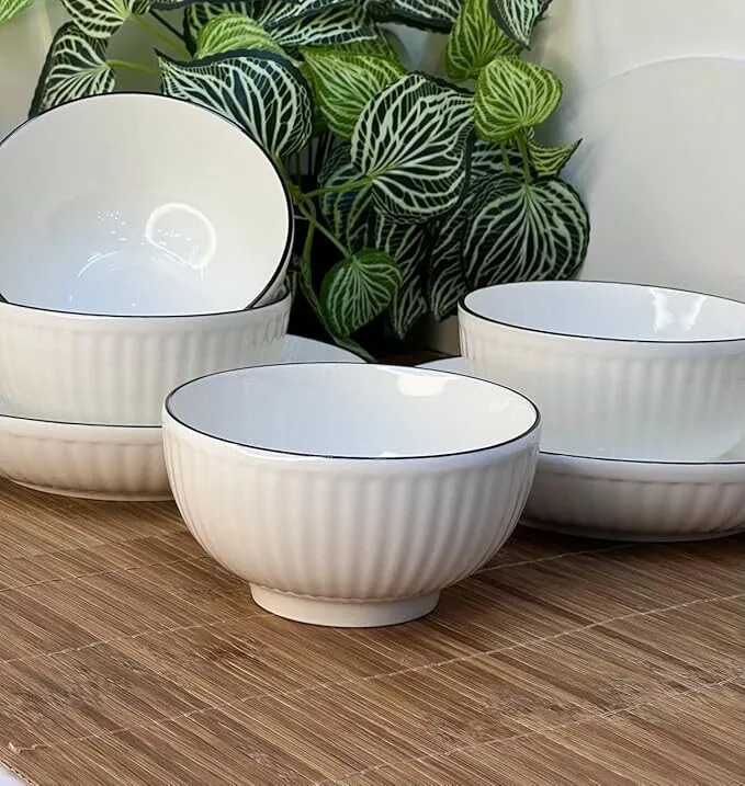 طقم فطار بورسلين 6 ق مخروطي ابيض مضلع بحز اسود بحافة سوداء