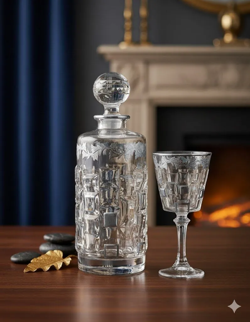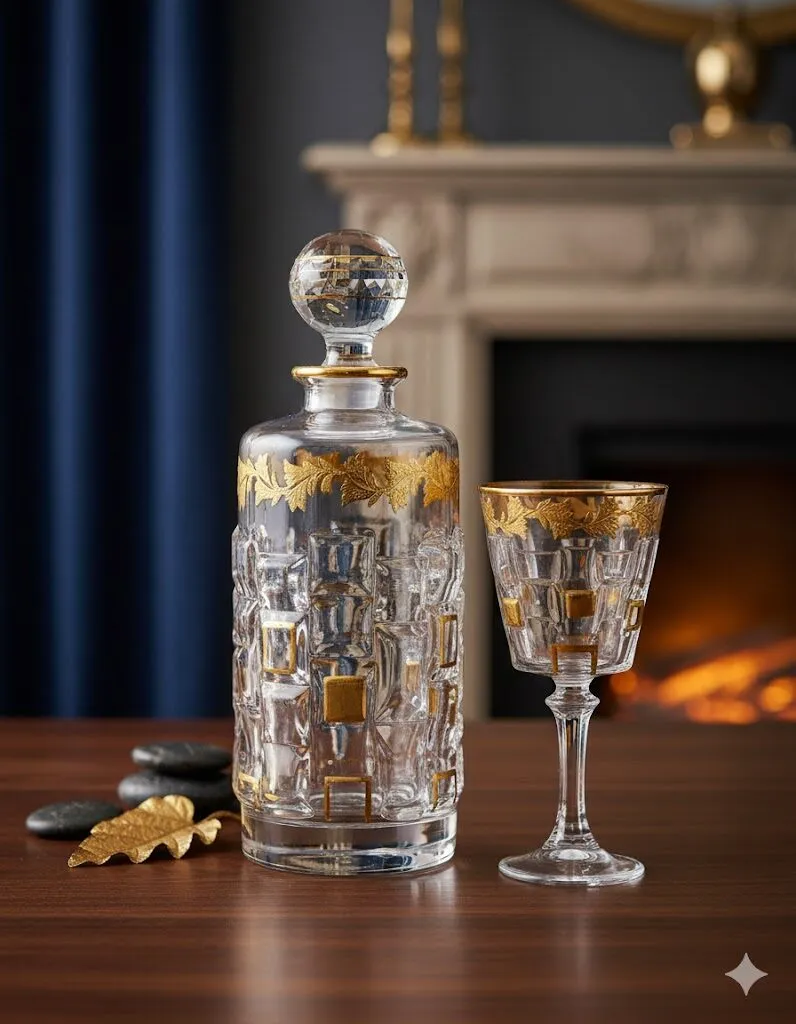 هذا الطقم الفاخر هو قطعة فنية بحد ذاتها، مصمم ليضيف لمسة من الرقي الملكي إلى أي مناسبة أو ركن عرض. يجمع هذا الثنائي الساحر بين القنينة المتميزة والكأس الأنيق، مما يجعله الخيار الأمثل لتقديم المشروبات الراقية أو كهدية تذكارية لا تُنسى.