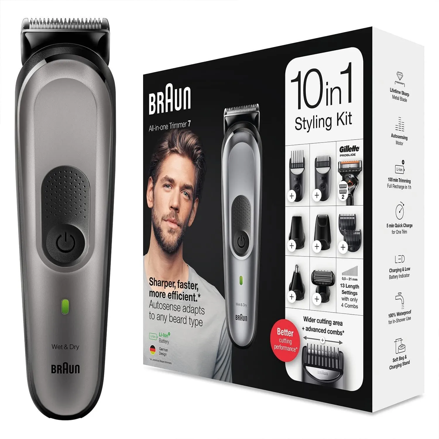 ماكينة تشذيب براون 10 في 1 تأتي بـ 8 ملحقات و ماكينة حلاقة جيليت بروجلايد مزودة بـ تقنية الاستشعار التلقائي التي تتكيف مع أي نوع لحية