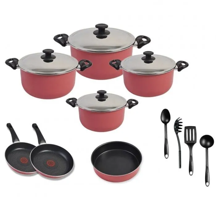 طقم 15 ق تيفال مينيت حلة (18+20+22+28) + مقلاية (20+22) + طاجن مستدير 26 + طقم زهران أسود ( معلقة + كبشة + اسباتولا + معلقة اسباجتي )
