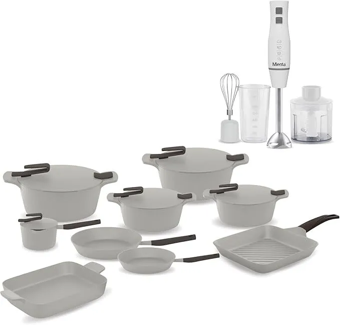 يتم تضمين قدر 16 سم للصلصات أو الأجزاء الصغيرة. تحتوي المجموعة أيضًا على 4 حوامل سيليكون للتعامل الآمن، و5 أدوات مطبخ أساسية، وكمكافأة خاصة، خلاط يدوي من ميانتا.