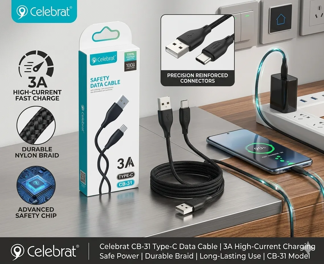 يعد كابل Celebrat CB-31 الحل الأمثل للباحثين عن الأداء القوي والأمان التام. صُمم هذا الكابل بتقنيات متطورة لضمان تجربة شحن مستقرة ونقل بيانات فائق السرعة، مع تحمل الخدمة الشاقة بفضل خاماته الممتازة.