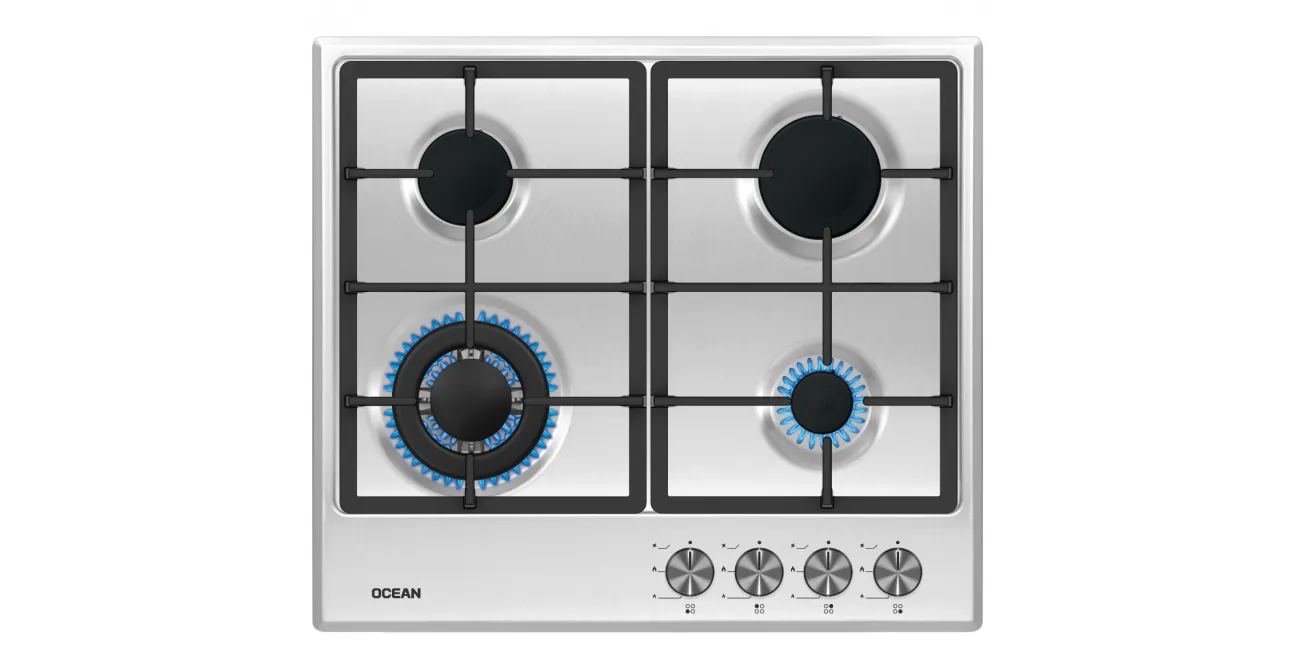 مسطح اوشن 60سم غاز ستانلس 4شعلة شكل مميز ولكل عين حمالة منفصلة حوامل زهر اشعال ذاتى امان كامل اربع مفاتيح امامية للتحكم ايطالي PW64IPRO